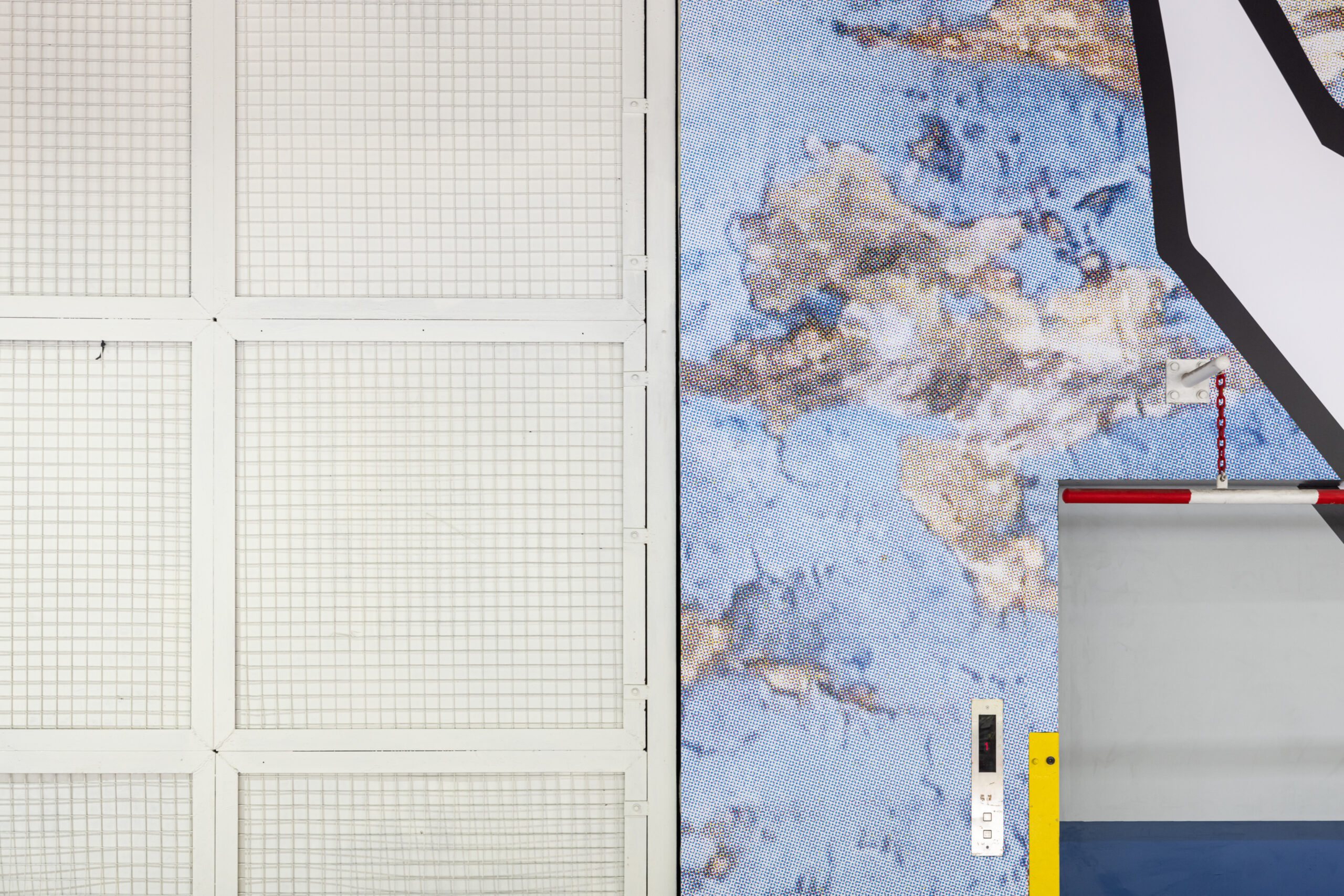 As part of the process of creating the mural, photographs of distressed metal containers, paint splattered walls, as well as high-resolution scans of textiles were digitally manipulated to accentuate different formal qualities. For example, paint drips were given a halftone treatment, dissolving the image into clusters of smaller dots. Similarly, the warp and weft of textiles were abstracted into simple lines of varying widths. These techniques are commonly used in silkscreen printing and graphic design to create the illusion of depth or gradients.