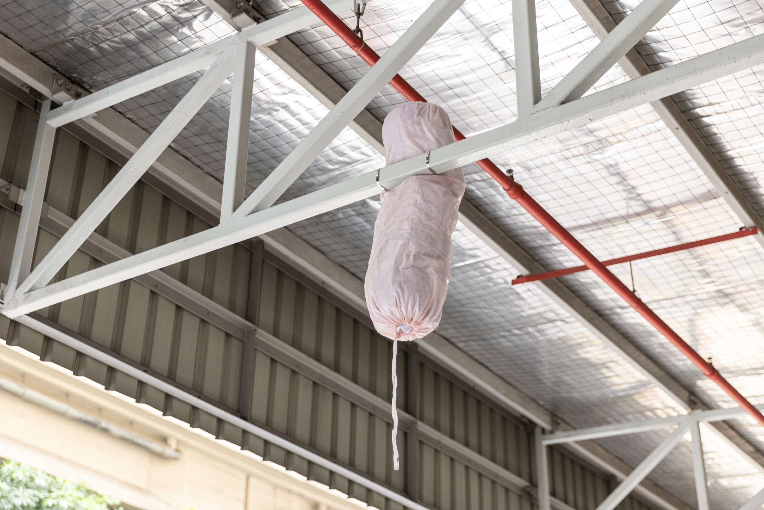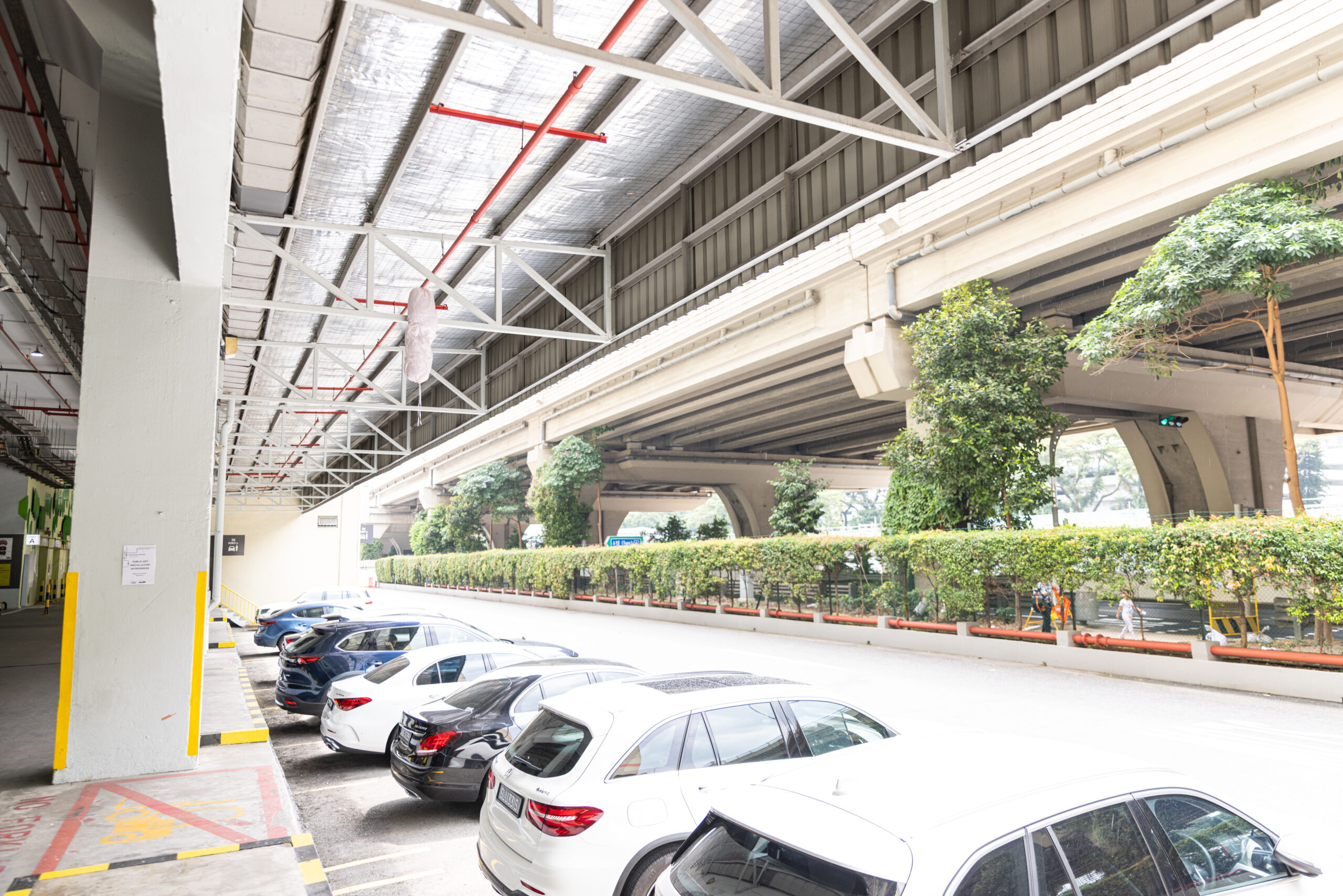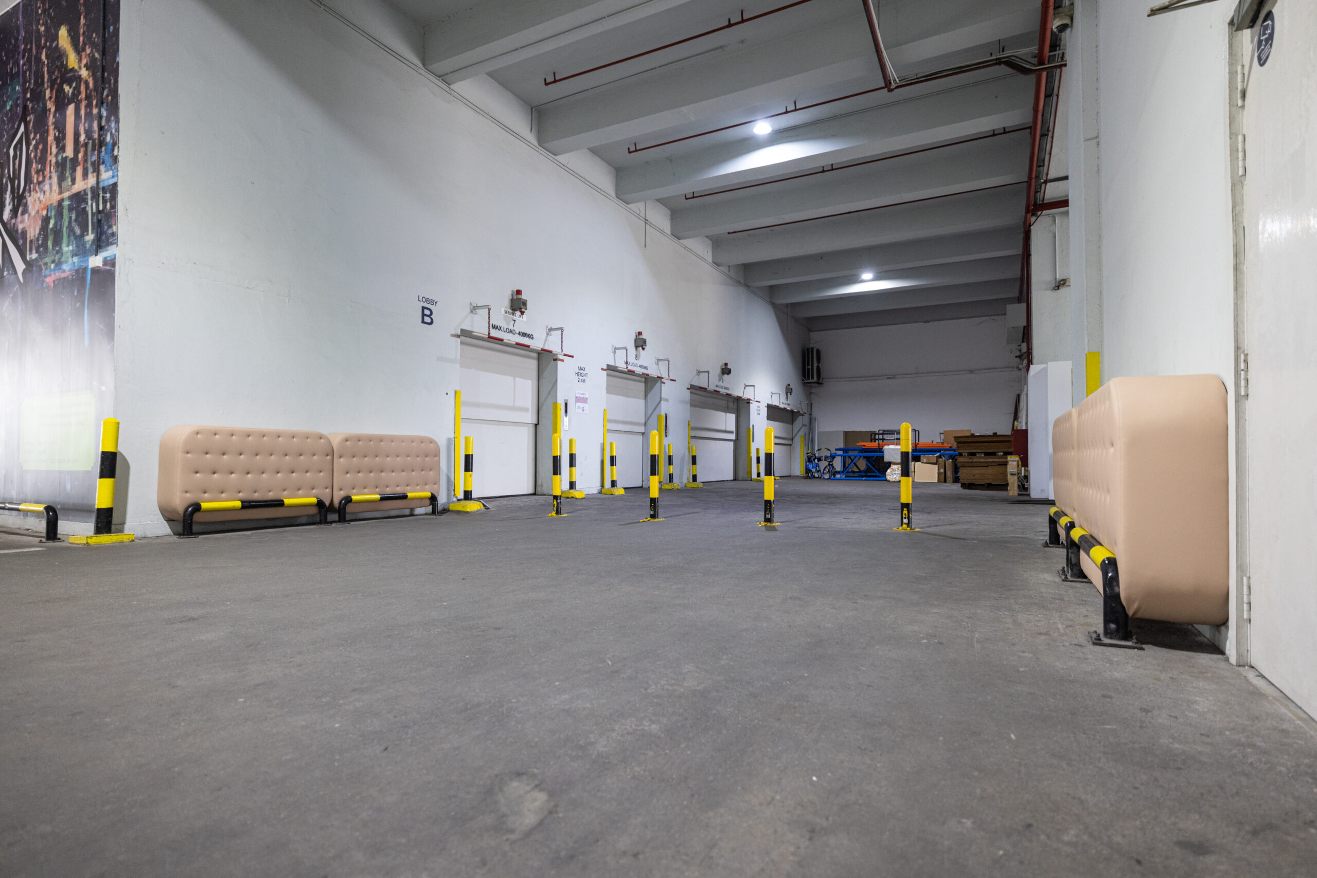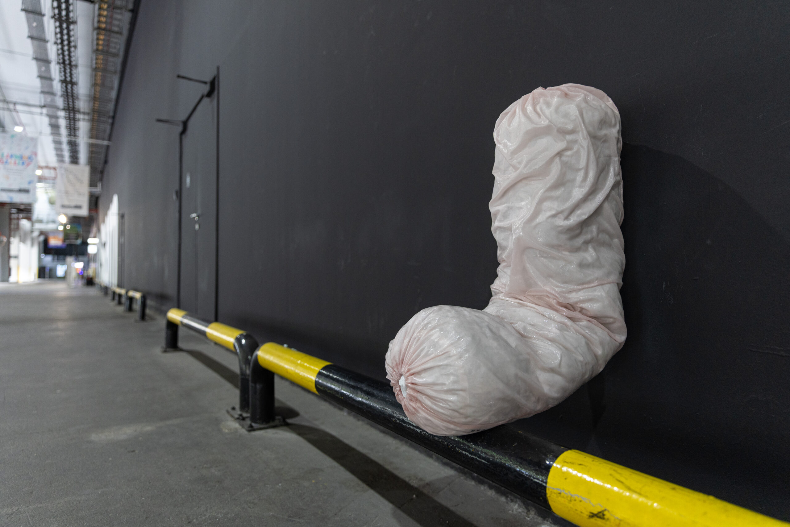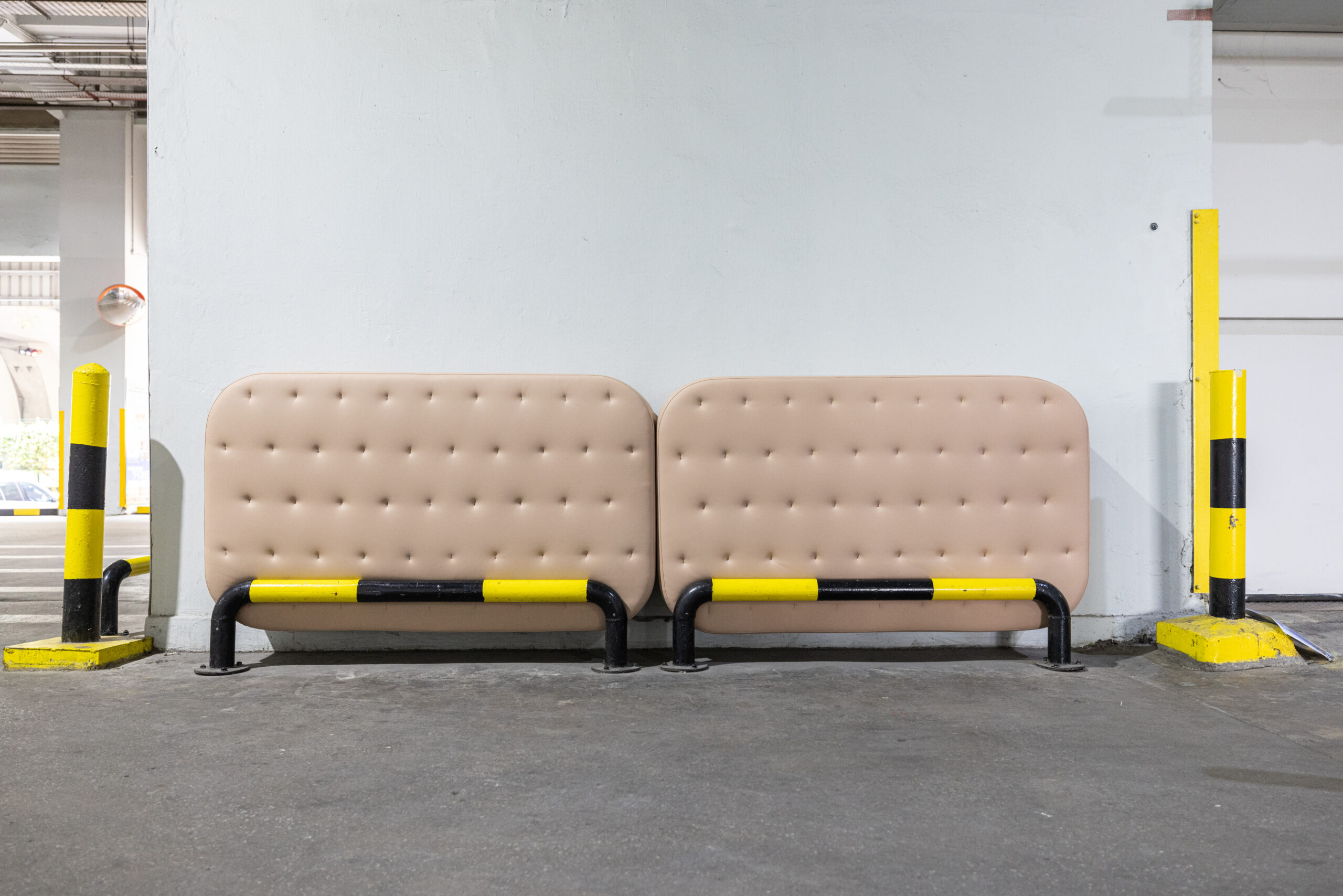 Through regular site visits, the artist observed how workers intuitively rest in in-between spaces, leaning into barrier gaps or sitting on ledges. Responding to these gestures, he introduced an additional intervention: a cushion embedded within the gap of a safety barrier, made from faux leather and foam. Subtle but purposeful, it transforms an overlooked ledge into an informal resting spot, an understated nod to the people who keep the site in motion.