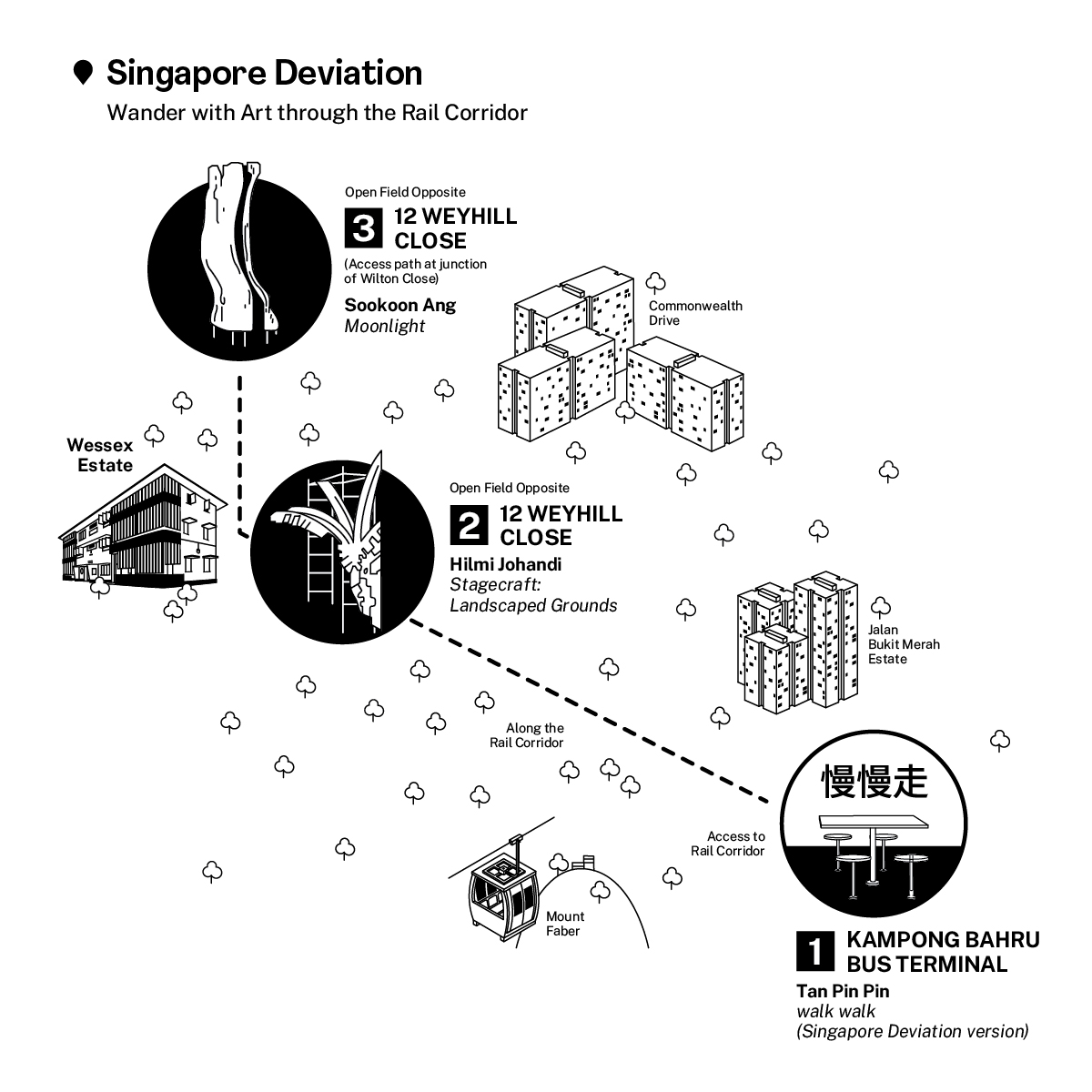 Singapore Deviation is a series of public art commissions exploring the iconic Rail Corridor in Singapore through the works of three artists: Sookoon Ang, Hilmi Johandi, and Tan Pin Pin. Conceived as site-specific installations, each artist offers a unique entry point into the evolving uses of the site, from colonial railway to wildlife corridor and recreational trail.